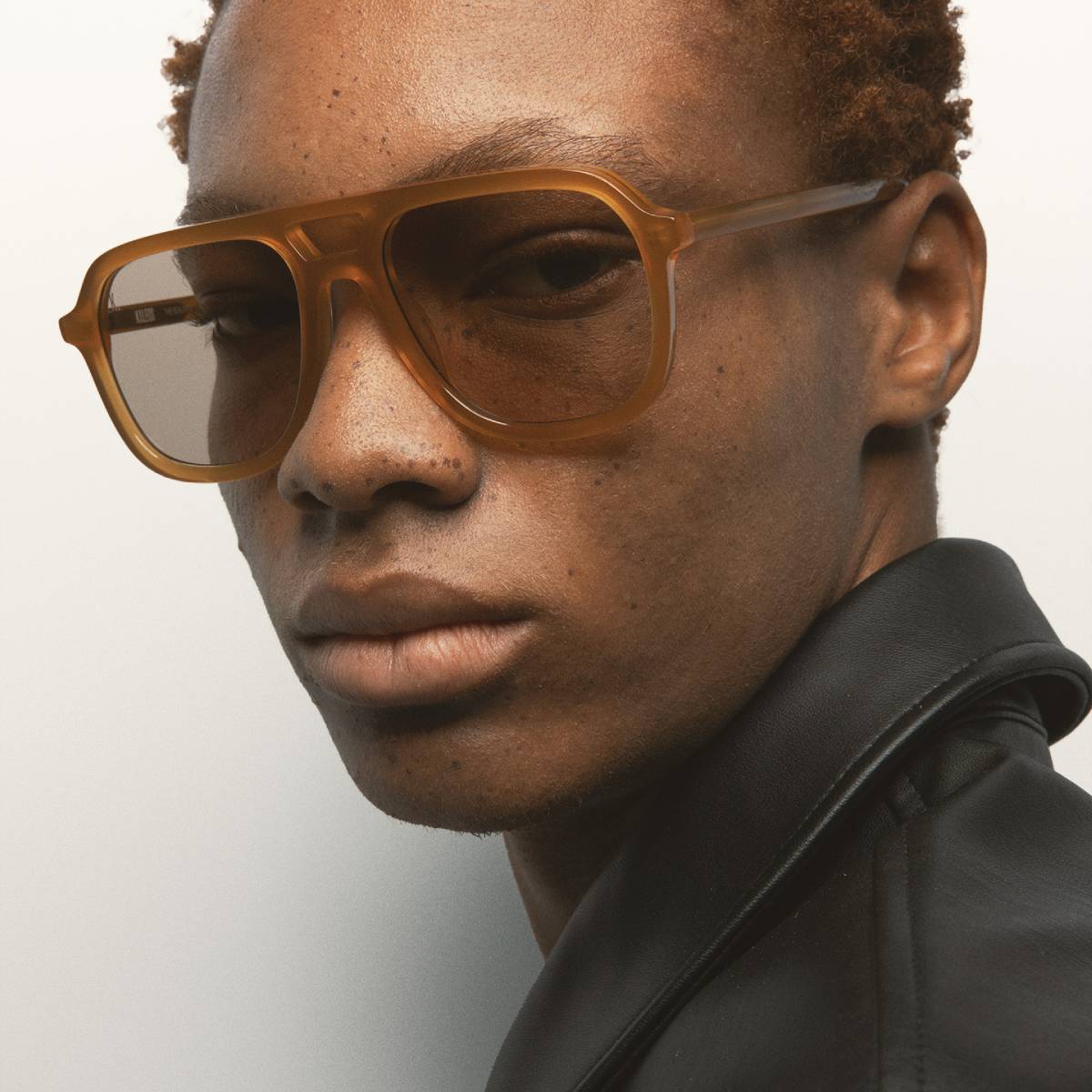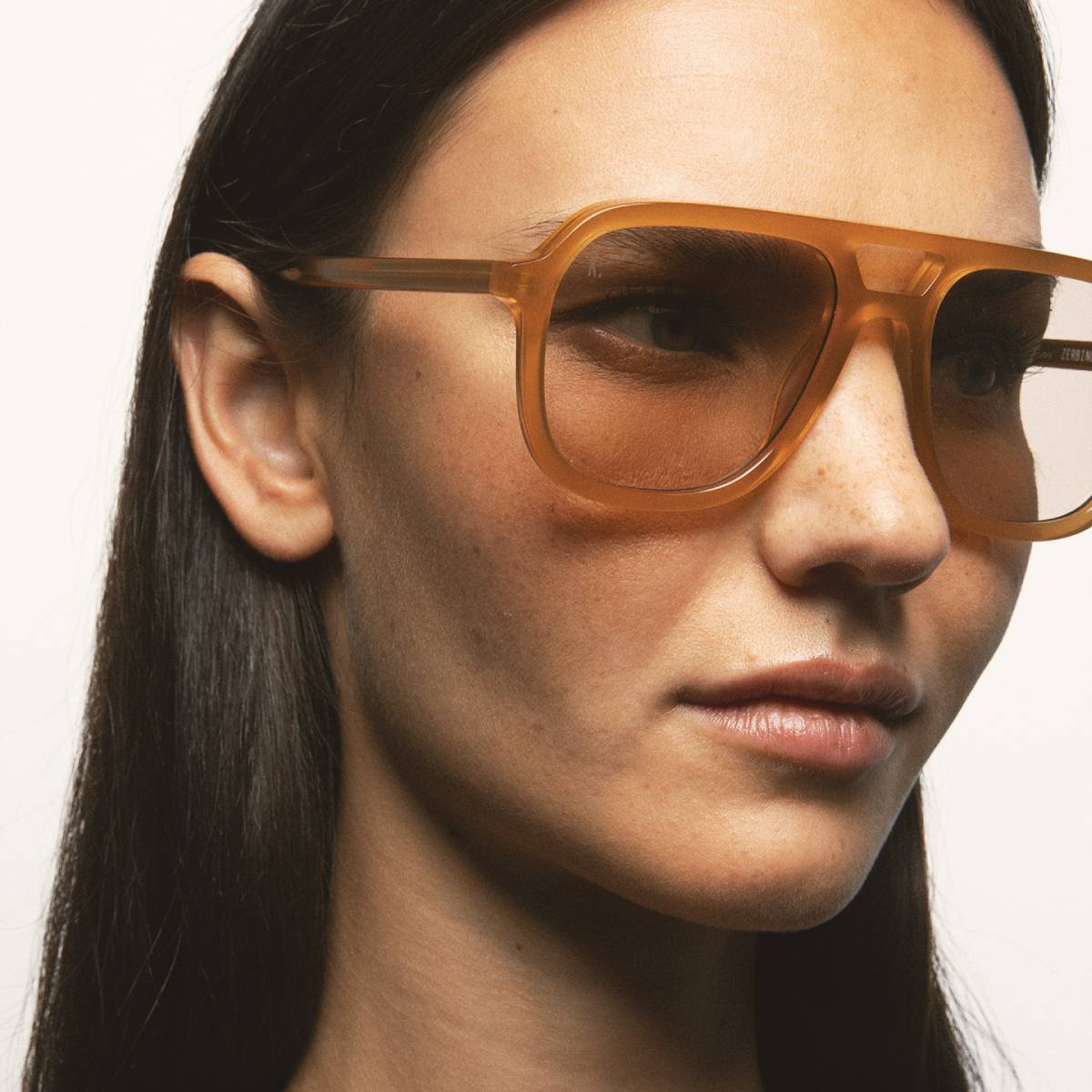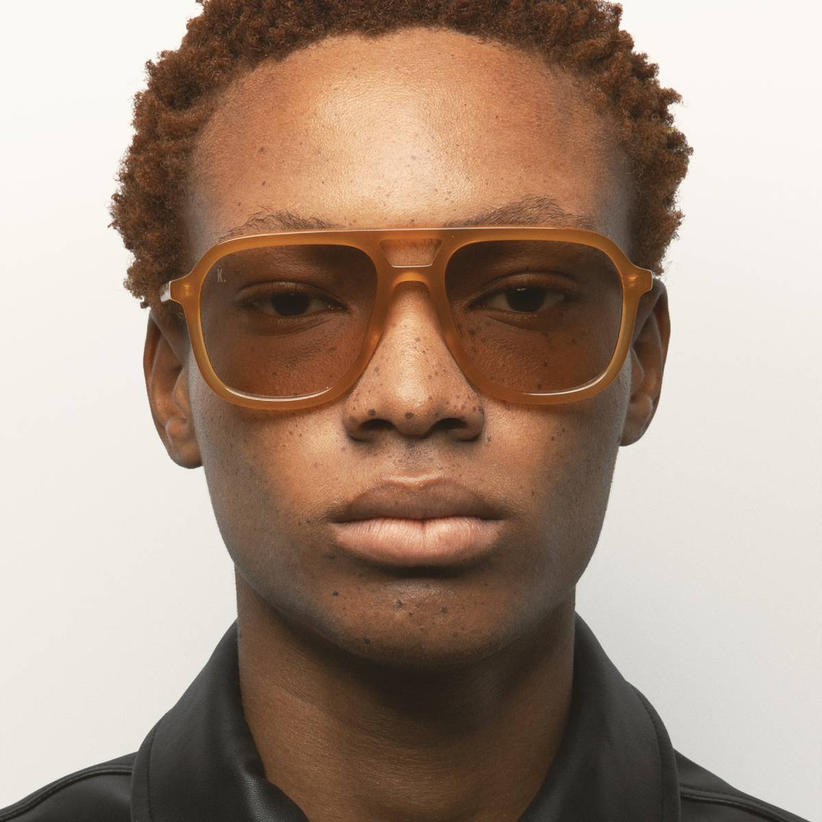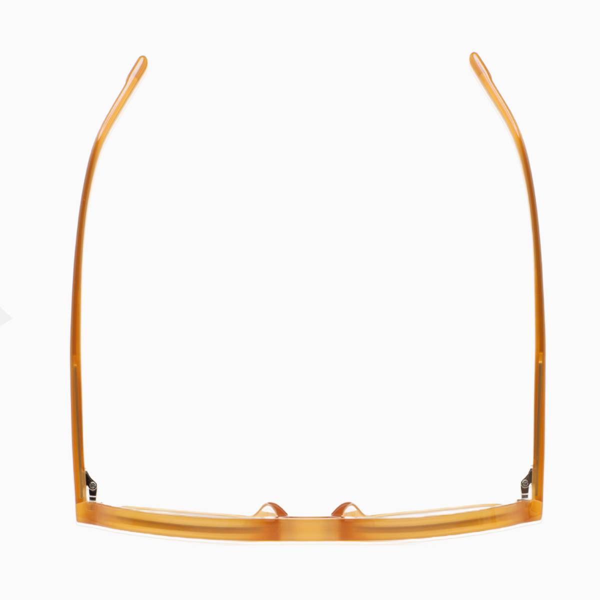 Gafa de sol de forma cuadrada doble puente. Frontal y varillas de acetato ámbar. Lente marrón fotocromática base 2 con protección UV y tratamiento antirreflejante. Lente Categoría 1-3. Plaquetas de acetato incorporadas. Hecha a mano.
