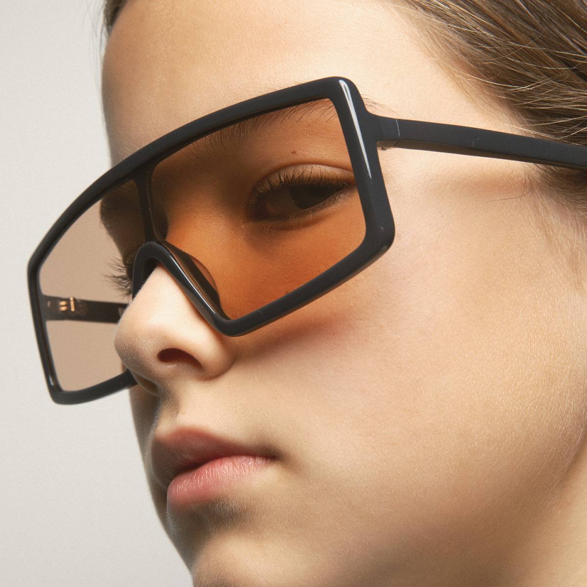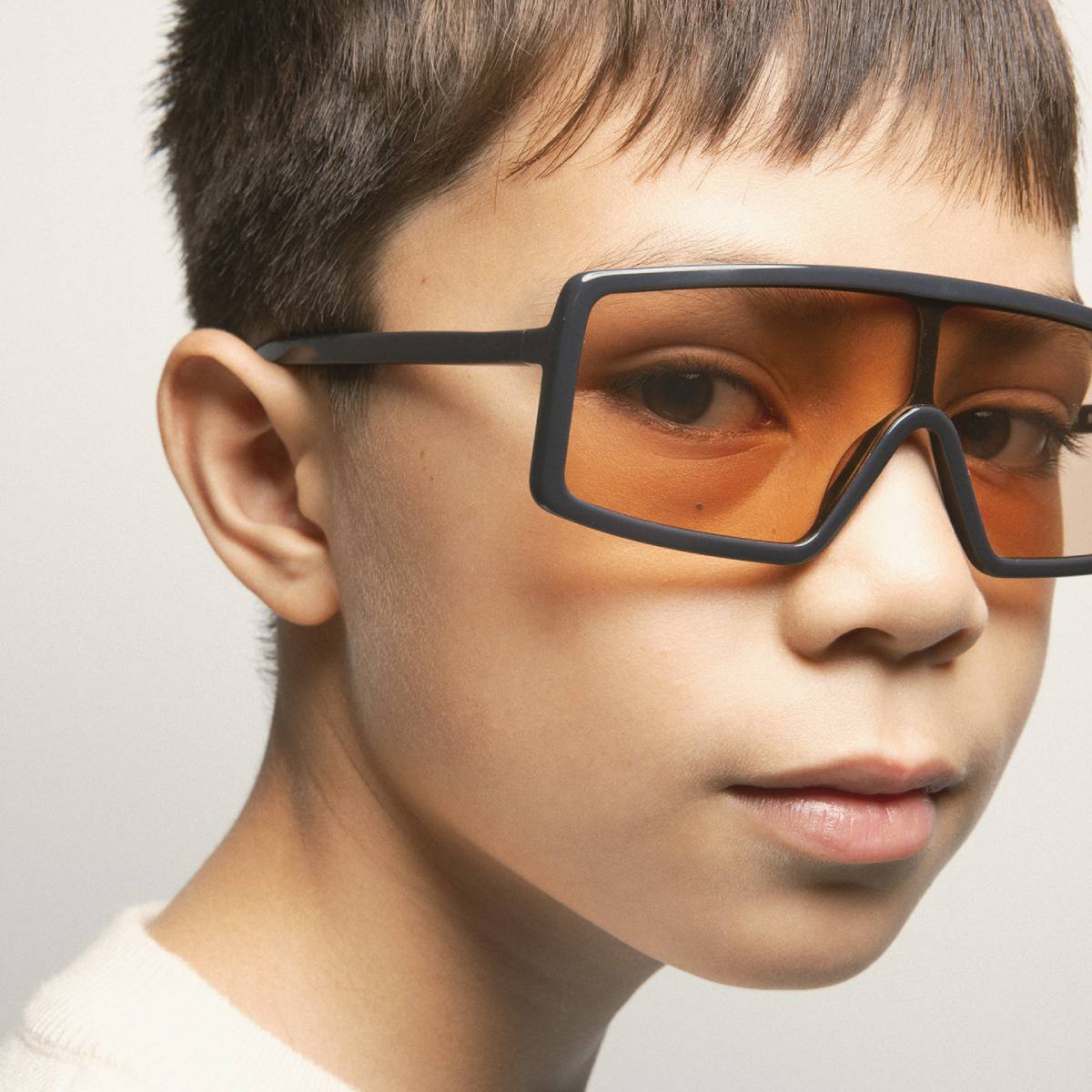 Pantalla KIDS con estructura de acetato gris. Varillas de acetato gris con terminal gris transparente. Lente marrón fotocromática base 2 con tratamiento antirreflejante. Lente Categoría 1-3. Plaquetas de acetato incorporadas. Hecha a mano.