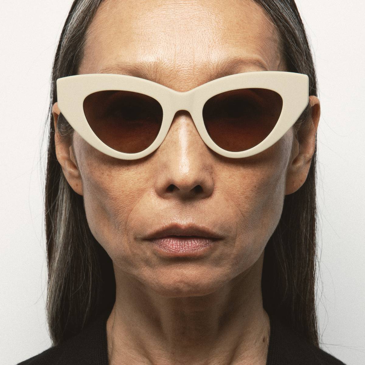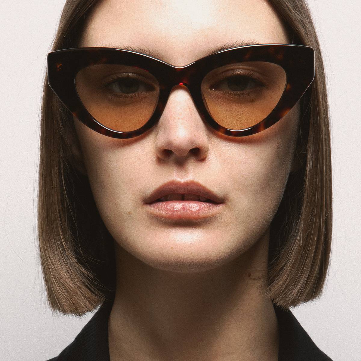 Gafa de sol de forma ojo-de-gato. Frontal y varillas de acetato. Lente marrón degradada base 2 con 100% protección UV y tratamiento antirreflejante. Lente Categoría 3. Plaquetas de acetato incorporadas. Hecha a mano.